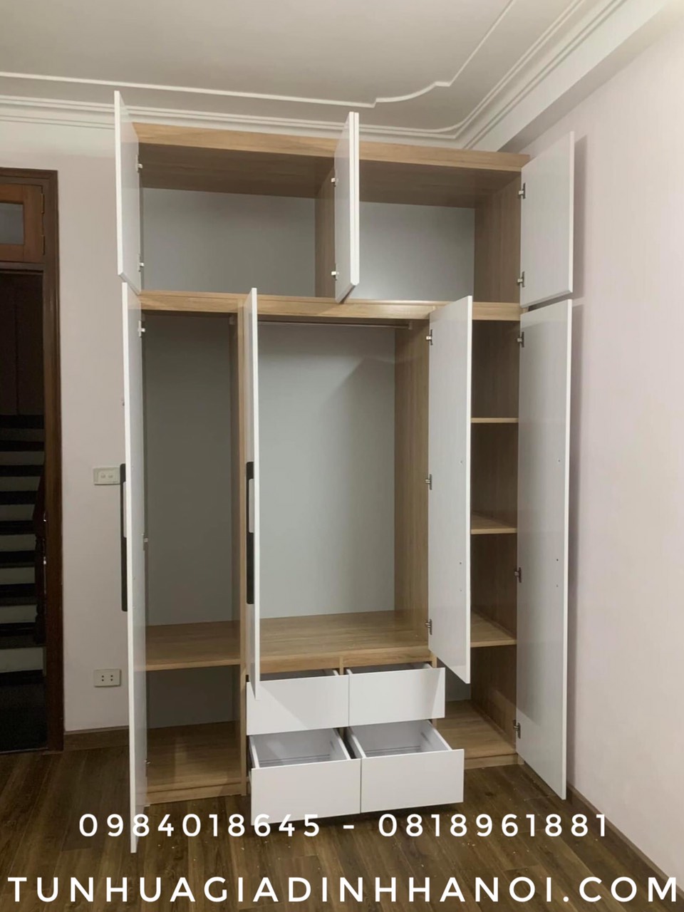 – 3 buồng: + Gồm 1 buồng đôi ở giữa với 2 cánh buồng rộng 80cm, dùng để đựng, treo những bộ quần áo vest,áo dài,đồ đầm,đồ kiểu…giúp không bị nhăn đồ